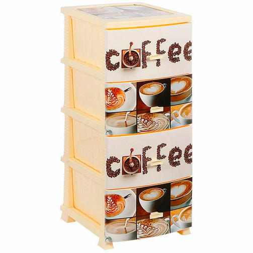 Пластиковый комод Росспласт с ящиками станет отличным решением для организации пространства в вашем доме. Универсальный дизайн позволяет использовать его в различных помещениях, включая прихожую, спальню и даже ванную. Благодаря принту с кофе на ящиках комод станет стильным элементом декора в любом интерьере. Изготовленный из высококачественного пластика, этот напольный предмет мебели отличается легкостью и прочностью. Компактные размеры делают пластиковую тумбочку идеальным выбором для квартир с ограниченной площадью. Высокий комод отлично подойдет для хранения вещей, одежды, игрушек, косметики, бытовой химии или лекарств. Благодаря своей функциональности он станет прекрасным подарком на день рождения, новоселье или любой другой праздник. Такая тумба для вещей отлично впишется как в гостиную или зал, так и в коридор создавая уютную атмосферу и обеспечивая удобное хранение одежды и мелочей. Она станет практичным дополнением на балконе или даче, где также важна организация хранения. Тумбочка с четырьмя ящиками обеспечивает максимальную вместимость и доступность. Эта модель идеально подойдет для людей, ценящих удобство и стиль. Комод станет стильным элементом декора в любом интерьере. 3 300,00 ₽ / шт