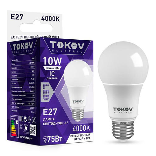 Лампа светодиодная 10Вт А60 4000К Е27 176-264В TOKOV ELECTRIC TKE