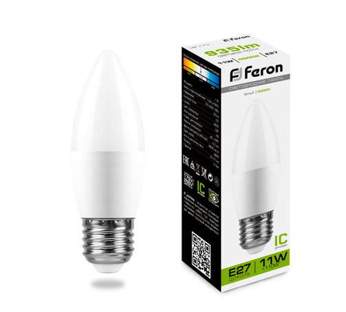Лампа светодиодная FERON LB-770, C37 (свеча), 11W 230V E27 4000К (белый), рассеиватель матовый белый, 935Lm, угол рассеивания 220°, 111*37мм, площадь освещения 2.2 кв.м., соответствует лампе накаливания - 110W 357,63 ₽ / шт