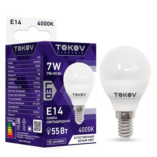 Лампа светодиодная 7Вт G45 4000К Е14 176-264В TOKOV ELECTRIC TKE-G45-E14-7-4K