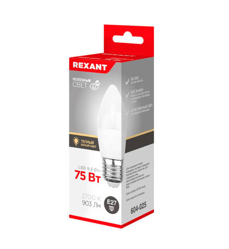 Светодиодная лампа в форме свечи применяется для освещения бытовых и офисных помещений. Цоколь – Е27. Расход потребляемой энергии такой лампы довольно экономичен в сравнении с другими видами ламп. Устройство излучает теплый свет, который комфортен как для работы, так и для отдыха. Лампа мощностью 9,5Вт обеспечивает надежную и стабильную работу в течение всего срока службы (30 часов). Электромагнитная совместимость, низкая пульсация, высокая цветопередача – все это совмещает в себе светодиодная лампа Свеча REXANT. Технические характеристики REXANT Свеча 9,5 Вт E27 903 лм 2700 K теплый свет 604-025 Тип светодиодная Мощность (Вт) 9.5 Напряжение 220 В Цоколь E27 Цветовая температура 2700 К Цветопередача 83 Ra Диаметр 38 мм Длина 100 мм Вид FR/матированная Тип колбы CN Форма свеча Световой поток 903 Лм Срок службы 30000 ч Эквивалент лампы накаливания 75 Вт Цветность теплый белый (менее 3300 К) Назначение общее освещение Регулировка яркости светового потока нет Диапазон рабочих температур от -10 до +40 °С Угол рассеивания 160 град Датчик движения нет Датчик освещенности нет Количество в упаковке 1 шт 210,00 ₽ / шт