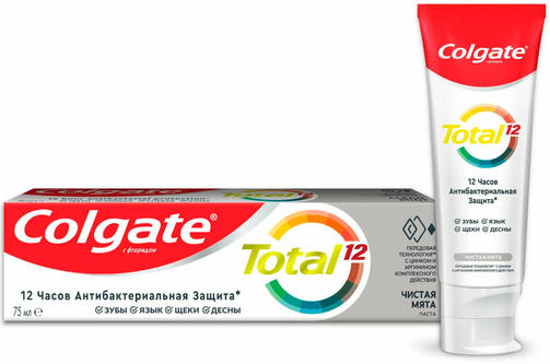 Colgate Зубная паста Total 12 Профессиональная чистая мята 75 мл. Для обеспечения здоровья всей полости рта необходима комплексная защита, а не только забота о зубах. Поэтому новый Colgate Total 12 Чистая Мята проактивно борется с бактериями не только на зубах, но и на языке, щеках и деснах в течение 12 часов*, обеспечивая здоровье всей полости рта. Почувствуйте разницу с уверенной, яркой и здоровой улыбкой! Новый Colgate Total 12 Чистая Мята содержит передовую формулу, которая проактивно защищает всю полость рта. Она борется с бактериями не только на зубах, но и на языке, щеках и деснах в течение 12 часов*. Новая формула обладает большим, чем когда-либо количеством преимуществ. Это значит, что это лучшая зубная паста для здоровья всей полости рта в линейке Colgate. Обеспечивает превосходную защиту от налета, признаков воспаления десен, потемнений на эмали, зубного камня и кариеса, а также обеспечивает дополнительные преимущества - борьбу с бактериями для защиты эмали, мгновенную нейтрализацию неприятного запаха изо рта и более длительное ощущение свежести. 243,67 ₽ / шт