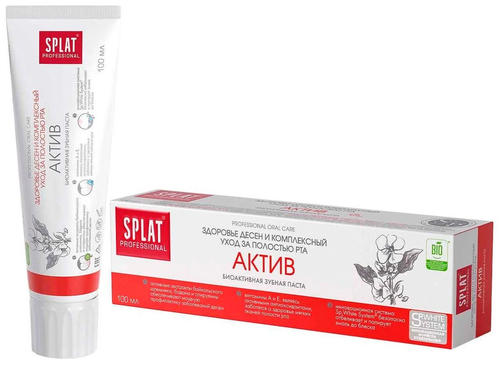 Зубная паста SPLAT Professional Актив объемом 100 мл представляет собой высококачественный продукт от известного российского бренда SPLAT. Особенностью пасты является ее состав, который включает в себя экстракты растений, такие как бергениа, байкалеанская склетран и спирулина. Эти компоненты обеспечивают комплексный уход за полостью рта, укрепляют эмаль и десны, а также способствуют реминерализации. Паста обладает антибактериальным эффектом, благодаря чему предотвращает развитие кариеса и воспаления десен. SPLAT Professional Актив не содержит лауретсульфата натрия, триклозана, хлоргексидина, красителей, продуктов животного происхождения и искусственных ароматизаторов. Это делает ее безопасной для использования даже при проглатывании. Зубная паста SPLAT Professional Актив имеет приятный вкус трав и растений, который не содержит искусственных ароматизаторов и отдушек. Способ применения пасты прост: рекомендуется чистить зубы два раза в день после приема пищи. При употреблении фтора из других источников рекомендуется консультация врача. Выбирая зубную пасту SPLAT Professional Актив, вы получаете качественный продукт, который обеспечивает комплексный уход за полостью рта и заботится о здоровье ваших зубов и десен. 218,58 ₽ / шт