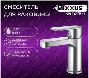 Смеситель для умывальника однорычажный MIXXUS BRUNO-001. Смеситель на умывальник, цвета хром, монтируется гайкой на одно отверстие. Это смеситель с литым, неповоротным, коротким изливом. Для корпуса, производитель MIXXUS использовал материал силумин, имеющий хорошую прочность и устойчивость к коррозии. Смеситель имеет хорошие технические характеристики для своей ценовой категории. Керамический картридж 35мм смешивает горячую и холодную воду. Преимуществом однорычажного управления являются быстрота настройки нужной температуры и напора, что способствует уменьшению расхода воды. Надежный смеситель – это незаменимый элемент любой ванной комнаты, который является неотъемлемой частью комфорта и удобства. Универсальный однорычажный смеситель для раковины и умывальника бренда MIXXUS – это идеальный выбор для тех, кто хочет добавить элегантности и стиля в свою ванную комнату. Наш кран отличается от других тем, что он не только красивый благодаря дизайну, но также функциональный и практичный. При производстве используются только высококачественные материалы. Данный смеситель изготовлен из сплава кремния и алюминия. Специальное износостойкое покрытие защитит поверхность от коррозии и повреждений. В комплект входит: смеситель; гибкая подводка (40см) – 2 штуки; комплект крепежа (Шпилька) MIXXUS – это давно известный производитель сантехнических изделий, в том числе смесителей. MIXXUS – производят в Китае на немецком оборудовании, и по немецким технологиям. Компания славится своим качеством, долговечностью и оригинальным дизайном своих изделий. MIXXUS разрабатывает и производит смесители для ванной комнаты, кухни и других помещений, предлагая разнообразные модели и стили, чтобы удовлетворить потребности даже самых требовательных покупателей. Одним из главных преимуществ смесителей MIXXUS является доступная цена при высоком качестве. Это позволяет обеспечить продукции долгий срок службы, а таже сохранить ее внешний вид на протяжении многих лет. 2 390,00 ₽ / шт