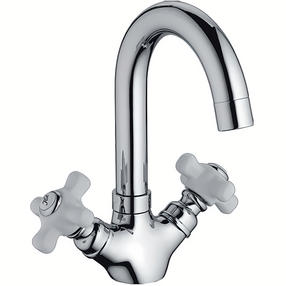 Смеситель для раковины Haiba HB1218 двухвентильный. Характеристики: Цвет: хром, белый. Материал: латунь. Материал вентилей: керамика. Тип излива: поворотный. Механизм: керамическая кран-букса. Управление: двухвентильное. С аэратором. Стандарт подводки: G 1/2. Тип крепления: шпилька. Монтаж: на раковину. Смеситель. Гибкая подводка. 4 200,00 ₽ / шт