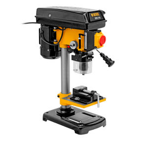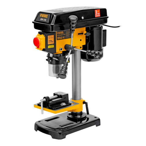 Настольный сверлильный станок Denzel DDM-350L 95321 мощностью 350 Вт поддерживает 5 уровней частоты вращения шпинделя, оснащен лазером и совместим с оснасткой диаметром 1-13 мм. Предназначен для сверления отверстий и шлифования деталей. Ременная передача позволяет успешно решать различные задачи. Повышенная частота вращения шпинделя позволяет эффективно обрабатывать плотные материалы и составляет 620-2620 об/мин, можно установить оптимальную в соответствии с поставленной задачей (предусмотрено 5 уровней). Надежный асинхронный двигатель обеспечивает длительную стабильную работу даже при интенсивном использовании. Станок пригодится в мастерской и гараже. Преимущества Надежная фиксация обрабатываемой детали — производитель предусмотрел специальные тиски. Высокое качество выполняемых работ — можно установить требуемую глубину сверления для получения одинаковых отверстий. Комфортная работа — перекрестный лазерный указатель значительно облегчает получение отверстий в заданной точке: после настройки системы станок будет сверлить в месте пересечения лучей. Удобное позиционирование — высота и угол наклона рабочего стола регулируются, что позволяет добиться оптимального положения заготовки. Надежность — основание и рабочий стол выполнены из чугуна и отличаются высокой прочностью. Безопасность пользователя — прозрачный кожух защищает от вылетающей стружки во время сверления. Продуманная конструкция — надежный электромагнитный выключатель с кнопкой аварийной остановки позволяет мгновенно прекратить работу при необходимости. 16 100,00 ₽ / шт