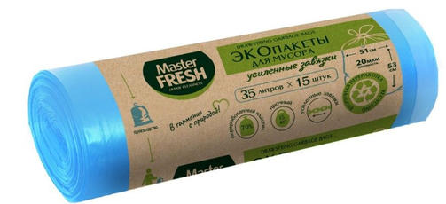 Master FRESH эко пакеты для мусора 70% recycling с усиленными завязками 35л 15шт голубые Прочные ЭКО пакеты для мусора Master Fresh на 70% производятся из вторичного переработанного сырья. Подлежат последующей переработке. Таким образом, сокращается вред, наносимый окружающей среде. Повышенная плотность ЭКО пакетов Master Fresh позволяет выдерживать нагрузку до 15 кг! Они оснащены усиленными завязками, которые выдерживают вес до 10 кг. Практичные и удобные в применении ЭКО пакеты мягкие на ощупь, из всей линейки пакетов для мусора их выделяет небесно-голубой цвет. Оптимальный размер пакетов идеально подходит для ведра объемом 15л. 88,30 ₽ / шт