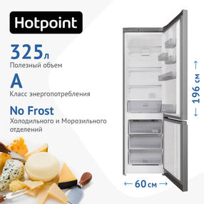 Двухкамерный холодильник Hotpoint HT 5200 S серебристый Общие данные: Размеры: высота (см): 196 ширина (см): 60 глубина (см): 62 Общий объем/ Полезный объем: Холодильника (л): -/325 Холодильной камеры (л): -/247 Морозильной камеры (л): -/78 Тип управления: электронный Класс энергопотребления: A Климатический класс: N-ST (от +16°С до +38°С) Количество компрессоров: 1 Годовое потребление энергии: 377 кВтч Цвет: серебристый Холодильное отделение: Полки из закаленного стекла Система No Frost (Frost Free, Ноу Фрост) Светодиодное освещение Быстрое охлаждение Ящик для фруктов и овощей Морозильное отделение: Система No Frost (Frost Free, Ноу Фрост) Время сохранения холода при отключении электроэнергии: 14 ч Мощность замораживания: 4 кг/сутки 3 отделения Дополнительная информация: Внешний дисплей Сигнал тревоги - звуковая индикация и мигающая лампа освещения сигнализируют о незакрытой двери холодильного отделения Уровень шума: 40 дБ Хладагент: R600A Эргономичная структура двери Антибактериальный уплотнитель Фронтальная ручка Стандартный компрессор 42 000,00 ₽ / шт