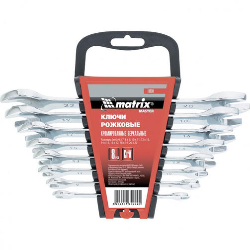 Набор ключей рожковых 8 шт, 6-22мм, CrV, Elliptical, зеркальное хромирование Matrix 15238
