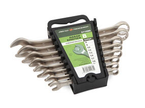 Набор из наиболее распространённых комбинированных гаечных ключей, с рожковым профилем на одной стороне и двенадцатигранным накидным профилем на другой. Состав набора: — ключи комбинированные: 8, 9, 10, 12, 13, 14, 17, 19 мм; — холдер. Классический вариант комбинированного гаечного ключа с рожковым профилем на одной стороне и двенадцатигранным накидным профилем на другой. Комбинированный ключ является самым распространенным вариантом гаечного ключа т.к. совмещает в себе возможности рожкового и накидного профилей. Накидной профиль отведён от продольной оси тела ключа на 15° это позволяет работать в ограниченном пространстве. Точность изготовления 12-гранного накидного профиля сводит к минимуму вероятность слизывания граней крепежа. Угол наклона рожковой части относительно продольной оси тела ключа — 15°, что позволяет довести минимальный угловой шаг при работе в труднодоступных местах до 30°. Ключи изготовлены из стали 6140CrV или аналогичной по характеристикам стали 31CrV3. 1 052,00 ₽ / шт