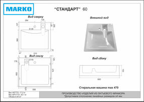 Мойка Стандарт 60 черный мрамор для установки над стиральной машиной с креплением 599мм*598мм*103мм