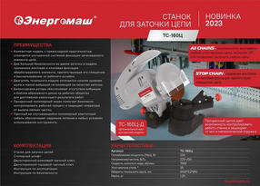 Заточной станок Энергомаш ТС-160Ц. Компактная модель с превосходной практичностью отличается улучшенной системой фиксации затачиваемого элемента цепи. С помощью этого инструмента пользователь может не только вернуть остроту пильным зубьям, но и выронить конфигурацию всех режущих элементов цепи. Предварительная установка глубины заточки позволяет достичь единый размер режущего зуба на всех звеньях затачиваемой цепи для равномерного распределения нагрузки по всей ее длине во время распиливания древесины, что предотвращает её внезапный разрыв на слабом участке и обеспечивает безопасность оператора. Конструкция станка состоит из основания с механизмом точной фиксации цепи и наклоняемым вниз точильным модулем с абразивным диском. Ограничитель угла наклона обеспечивает получение одинаковой режущей кромки зубьев на всех звеньях затачиваемой цепи. Для большей безопасности во время заточки в модели применена винтовая и клиновая фиксация обрабатываемого элемента, препятствующая его смещению и выскальзыванию из рабочего ручейка. Прижимной механизм обеспечивает точность зажима зубьев цепи под требуемым углом к рабочей поверхности абразивного диска для получения правильной конфигурации режущих плоскостей. Поворотный механизм с изменяемой фиксацией положения зажимного приспособления сокращает до минимума количество переустановок обрабатываемой цепи значительно упрощая и ускоряя процесс заточки. Для наилучшей организации технологического процесса компактный размер станка позволяет оператору брать его с собой и устанавливать в любом удобном месте рабочего пространства, а благодаря безопасному прижимному механизму возможна уверенная заточка цепей любой длины, несмотря на его компактные размеры. Двигатель точильного модуля отличается низким уровнем шума и малой вибраций не влияющей на качество заточки. Балансировка ротора обеспечивает отсутствие вибрации и биения абразивного диска на рабочих оборотах для достижения наилучшего результата работ. Защитный кожух, закрывающий абразивный диск для большей безопасности, устойчив к поверхностному воздействию отлетающих при заточке стальных опилок и абразивной пыли. Прозрачный полимерный экран помогает безопасно контролировать рабочий процесс и защищает оператора от вылета мелких частиц. Прочный не спутывающийся полимерный эластичный кабель обеспечивает надежное питание в любых условиях использования инструмента. 3 740,00 ₽ / шт