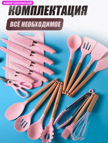 Набор кухонных принадлежностей 19шт РОЗОВЫЙ силикон+дерев.ручка (7002К)
