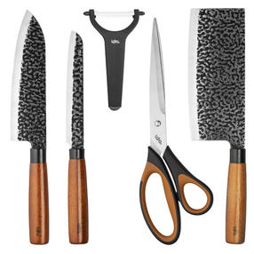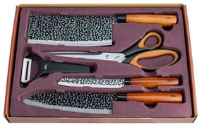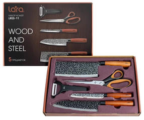 Набор ножей LARA в подарочной упаковке собрал в себя инструменты, с помощью которых вы без труда разделаете мясо или нашинкуете овощи. В комплект входит овощечистка с керамическим лезвием, ножницы с прорезиненными ручками и 3 вида ножей: сантоку, универсальный и топорик. Все ножи выполнены из высокоуглеродистой нержавеющей стали 3Cr14. Финишная отделка клинка имеет специальное антиналипающее покрытие. Выемки на лезвии создают воздушную прослойку при резке. Лезвие с идеальной заточкой режущей кромки долгое время остается острым. Удобная рукоять из темной древесины со стальным черным больстером придает дизайну ножа завершенный вид. 1 244,00 ₽ / шт
