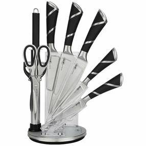Набор ножей, 9 предметов, (поварской нож -2,5mm/8", нож разделочный -2,5mm/8", нож -топорик -2,5/6,5", нож универсальный -2,0mm/5", нож для овощей – 2,0mm/3,5", мусат, ножницы, овощечистка с керамическим лезвием) ручки - нержавеющая сталь с декором, складная подставка из акрила, подарочная упаковка c пластиковой ручкой. 4 000,00 ₽ / шт
