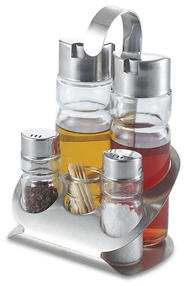 6-ти предметный набор для специй; в комплекте: емкость для масла, емкость для уксуса, емкость для соли, емкость для перца, емкость для зубочисток, подставка; материал емкостей: стекло; материал подставки, салфетницы: хромированый метал. 785,00 ₽ / шт