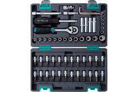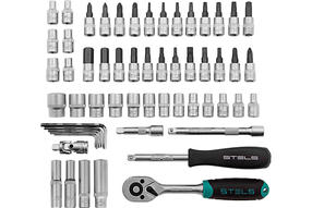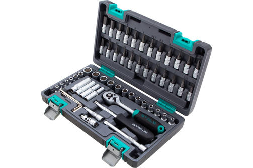 Набор инструментов STELS 1/4 CrV пластиковый кейс 57 предметов 14101 позволяет проводить бытовой ремонт дома, обслуживать автомобиль, монтировать и демонтировать резьбовые соединения. Комплект из 57 инструментов поставляется в ударопрочном пластиковом кейсе. Все изделия выполнены из высокопрочной хромованадиевой стали. Двухкомпонентная рукоятка у трещоточного ключа обеспечивает комфортную работу и надежное удержание. 4 500,00 ₽ / шт