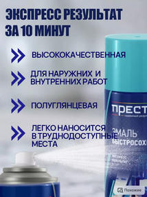 Эмаль акриловая аэрозольная Престиж универсальная быстросохнущая синяя 425 мл - это современный материал для окраски различных поверхностей. Данный продукт отличается высокой устойчивостью к воздействию внешних факторов, таких как влага, солнечный свет, механические повреждения, что обеспечивает долговечность окрашенной поверхности. Эмаль акриловая аэрозольная Престиж универсальная имеет быстрое время высыхания, что позволяет сократить время выполнения работ и увеличить производительность труда. Кроме того, она имеет удобную форму флакона-аэрозоля, которая обеспечивает легкость в использовании и равномерность распределения краски. Данная эмаль подходит для окраски металлических, деревянных, стеклянных, пластиковых и других поверхностей. Она легко наносится на любую поверхность и обладает высокой адгезией к материалу. Кроме того, эмаль акриловая аэрозольная Престиж универсальная синего цвета обладает ярким, насыщенным оттенком, который сохраняется долгое время. Она прекрасно подходит для окраски металлических изделий, автомобилей, деталей и других поверхностей. В целом, эмаль акриловая аэрозольная Престиж универсальная быстросохнущая синяя 425 мл - это отличный выбор для быстрой и качественной окраски различных поверхностей. Она легка в использовании, обладает высокой стойкостью и ярким оттенком, что обеспечивает долговечность окрашенной поверхности. 320,00 ₽ / шт