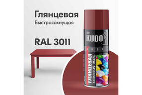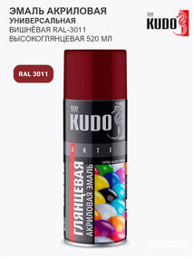 Высокоглянцевая акриловая эмаль KUDO вишнёвая RAL 3011, аэрозоль 520 мл 11606497 предназначена для окрашивания предварительно загрунтованных поверхностей (металлических, деревянных, бетонных, пластиковых и пр.) эксплуатируемых снаружи и внутри помещения. Обеспечивает отличный результат для любых декоративных и оформительских работ. Цветовая палитра изготовлена в соответствии с европейским цветовым стандартом RAL. 345,00 ₽ / шт