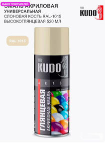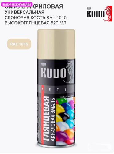 Высокоглянцевая акриловая эмаль KUDO слоновая кость RAL 1015, аэрозоль 520 мл 11606494 предназначена для окрашивания предварительно загрунтованных поверхностей (металлических, деревянных, бетонных, пластиковых и пр.) эксплуатируемых снаружи и внутри помещения. Обеспечивает отличный результат для любых декоративных и оформительских работ. Цветовая палитра изготовлена в соответствии с европейским цветовым стандартом RAL. 359,00 ₽ / шт