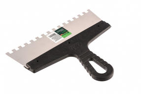 Шпатель Сибртех 85474 шириной 250 мм, из нержавеющей стали, с пластмассовой ручкой и зубьями 8 х 8 мм, применяется для равномерного нанесения клея при укладке мелкоформатной плитки, мозаики и т.д. Квадратные зубья облегчают нанесение клеевого состава, позволяя ровно и экономно распределять его по поверхности. Зубья размером 8 х 8 мм рассчитаны на плитку площадью 400-900 см2. Преимущества Упругое полотно — при изгибающих нагрузках шпатель быстро восстанавливает свою форму. Коррозионная стойкость — рабочее полотно выполнено из нержавеющей стали. Надежный хват — инструмент имеет эргономичную рельефную ручку. Удобство — рукоятка выполнена с небольшим наклоном для комфортного нанесения и выравнивания растворов. Практичное хранение — в рукоятке предусмотрено отверстие для подвешивания шпателя. 159,00 ₽ / шт
