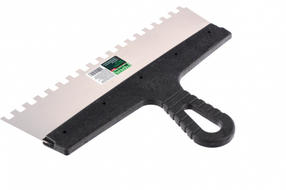 Шпатель Сибртех 85476 шириной 300 мм, из нержавеющей стали, с пластмассовой ручкой и зубьями 8 х 8 мм, применяется для равномерного нанесения клея при укладке мелкоформатной плитки, мозаики и т.д. Квадратные зубья облегчают нанесение клеевого состава, позволяя ровно и экономно распределять его по поверхности. Зубья размером 8 х 8 мм рассчитаны на плитку площадью 400-900 см2. Преимущества Упругое полотно — при изгибающих нагрузках шпатель быстро восстанавливает свою форму. Коррозионная стойкость — рабочее полотно выполнено из нержавеющей стали. Надежный хват — инструмент имеет эргономичную рельефную ручку. Удобство — рукоятка выполнена с небольшим наклоном для комфортного нанесения и выравнивания растворов. Практичное хранение — в рукоятке предусмотрено отверстие для подвешивания шпателя. 170,00 ₽ / шт
