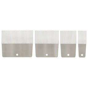 Набор гребенок Matrix 86813 включает 4 предмета и применяется для создания фактурного рисунка на поверхности тонкой штукатурки, шпатлевки и лакокрасочных покрытий Гребенки с прямыми зубьями позволяют оригинально украсить стены в домашних условиях без помощи специалистов. Преимущества Гребенки изготовлены из марганцовистой стали, которая обладает высокой износостойкостью и прочностью. В набор входят гребенки шириной 27 мм, 52 мм, 77 мм и 103 мм, что делает удобной работу на различных поверхностях, в том числе в труднодоступных местах. На ручках гребенок имеются отверстия для подвесного хранения. 800,00 ₽ / шт