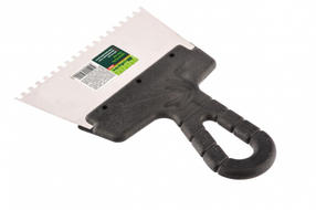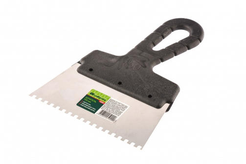 Шпатель Сибртех 85455 шириной 150 мм, из нержавеющей стали, с пластмассовой ручкой и зубьями 4 х 4 мм, применяется для равномерного нанесения клея при укладке мелкоформатной плитки, мозаики и т.д. Квадратные зубья облегчают нанесение клеевого состава, позволяя ровно и экономно распределять его по поверхности. Зубья размером 4 х 4 мм рассчитаны на плитку площадью 50-100 см2. Преимущества Упругое полотно — при изгибающих нагрузках шпатель быстро восстанавливает свою форму. Коррозионная стойкость — рабочее полотно выполнено из нержавеющей стали. Надежный хват — инструмент имеет эргономичную рельефную ручку. Удобство — рукоятка выполнена с небольшим наклоном для комфортного нанесения и выравнивания растворов. Практичное хранение — в рукоятке предусмотрено отверстие для подвешивания шпателя. 140,00 ₽ / шт