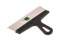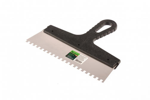 Шпатель Сибртех 85465 шириной 250 мм, из нержавеющей стали, с пластмассовой ручкой и зубьями 6 х 6 мм, применяется для равномерного нанесения клея при укладке мелкоформатной плитки, мозаики и т.д. Квадратные зубья облегчают нанесение клеевого состава, позволяя ровно и экономно распределять его по поверхности. Зубья размером 6 х 6 мм рассчитаны на плитку площадью 100-400 см2. Преимущества Упругое полотно — при изгибающих нагрузках шпатель быстро восстанавливает свою форму. Коррозионная стойкость — рабочее полотно выполнено из нержавеющей стали. Надежный хват — инструмент имеет эргономичную рельефную ручку. Удобство — рукоятка выполнена с небольшим наклоном для комфортного нанесения и выравнивания растворов. Практичное хранение — в рукоятке предусмотрено отверстие для подвешивания шпателя. 179,00 ₽ / шт
