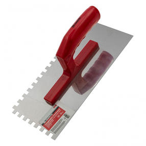Гладилка Matrix 86782 размером 280 x 130 мм, из нержавеющей стали, с зубьями 8 x 8 мм, зеркальной полировкой и пластмассовой ручкой, пригодится любителям и частным мастерам при проведении ремонтных работ. Она позволяет равномерно наносить строительные растворы и плиточный клей на подготовленные под отделку поверхности. Преимущества Долговечность — гладилка из нержавеющей стали не боится коррозии, обладает оптимальным соотношением упругости и прочности. Высокое качество работ — отполированное полотно обеспечивает максимально равномерное распределение растворов, в том числе быстрозастывающих. Комфортная эксплуатация — эргономичная пластиковая ручка удобно лежит в руке, что позволяет долго работать без усталости. 547,00 ₽ / шт