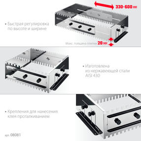 Предназначена для быстрой работы с большим объемом работ по укладке плитки шириной до 600мм. Сделана из стали AISI 430, благодаря которой гребенка обладает повышенными эксплуатационными характеристиками. Имеет 4 рабочих профиля с величиной зубьев 8, 10, 12 и 14мм для универсального подхода к любым задачам. Боковые регуляторы помогут закрепить гребенку на рабочей поверхности и настроить её по высоте под любую плитку. Легко моется, не боится влаги. Преимущества Нержавеющая сталь Для плитки до 600мм Быстрая сборка Долговечный 7 989,00 ₽ / шт