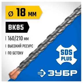 Бур ЗУБР Профессионал (18х210 мм; SDS-plus) 29314-210-18_z02 имеет повышенный ресурс благодаря усиленному наконечнику из твердого сплава ВК85; БЫСТРЫЙ: конструкция головки бура из наконечника с двумя резцами и центрирующим острием для быстрого сверления.; ДИНАМИЧНЫЙ: геометрия наконечника в форме зубила для динамичного и агрессивного врезания в материал.; ПРОИЗВОДИТЕЛЬНЫЙ: спираль 4С с усиленным сердечником обеспечивает оптимальное соотношение между устойчивостью к излому бура и быстрым отводом шлама, подавляет вибрацию и способствует лучшей передаче энергии удара непосредственно на твердосплавный резец. 682,00 ₽ / шт