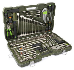 Набор включает в себя инструмент с присоединительным квадратом на 1/4”, 3/8”, 1/2”, что обеспечивает взаимозаменяемость головок и приводов любого из профилей. Таким образом увеличивается количество возможных вариантов подбора требуемой головки с учётом расположения крепежа и выбора привода необходимого размера. Набор инструментов 147 предметов в чемодане подходит для ремонта автомобиля, мотоцикла и другой техники в гараже, мастерской, поездке или автопутешествии. Размеры кейса: 600×380×85 мм Вес: 15,5 кг Особенности набора: — Пять переходников для полной взаимозаменяемости присоединительных квадратов — Шарнирная трещотка 3/8˝ для удобной работы в ограниченном пространстве — Торцевые головки 3/8'' с 12-гранным рабочим профилем — Разрезные ключи для работы с гидравлическими системами — Молоток 500 граммов с фиберглассовой рукояткой — 1/2” шарнирный удлиненный вороток 430 мм — Яркие накладки обозначают крышку кейса — Четыре усиленных замка и усовершенствованная система крепления петель. 21 700,00 ₽ / шт