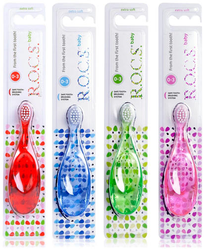 В возрасте 0 до 3-х лет зубы ребенку должны вычищать родители, соблюдая правильную технику чистки зубов. Уникальная форма ручки позволяет избежать избыточного надавливания на зубы и десны малыша во время чистки, не повреждая десны и незрелую эмаль зубов. Ручка зубной щетки R.O.C.S. выполнена из высококачественного безопасного пластика PET и обладает уникальной формой, удобной в использовании как малышу, так и родителям. Широкая форма ручки препятствует глубокому проникновению щетки в полость рта ребенка. Щётка разработана при участии детских стоматологов. Экстрамягкая щетина с уникальной тройной полировкой кончиков не повреждает нежную десну и хрупкую эмаль зубов. Широкая форма ручки, препятствующая глубокому проникновению щетки в полость рта ребенка. Ручка-кусалка из высококачественного и безопасного пластика PET. Структура пластика и однородность уменьшают возможность задержки бактерий на поверхности ручки. 160,00 ₽ / шт