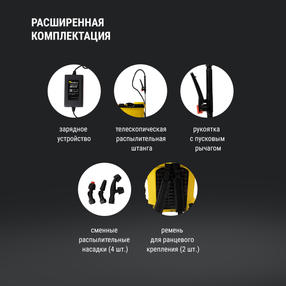 УНИВЕРСАЛЬНОЕ ИСПОЛЬЗОВАНИЕ: опрыскиватель используется в садоводстве для равномерного орошения растений с применением удобрений и химикатов, а также в быту для дезинфекции. АВТОНОМНОСТЬ: встроенный энергоемкий аккумулятор не требует постоянного источника питания, позволяя использовать прибор в местах с отсутствием электричества. ВЫСОКАЯ ПРОИЗВОДИТЕЛЬНОСТЬ: мощный насос и регулятор скорости подачи жидкости расширяют применяемость опрыскивателя, а вместительный бак позволяет распылять значительный объем жидкости. ТЕЛЕСКОПИЧЕСКАЯ ТРУБКА: прибор оснащен распылительной штангой с регулировкой длины для комфортного использования на высоте и в труднодоступных местах. ИНДИКАТОР УРОВНЯ ЗАРЯДА: позволяет оценить время работы опрыскивателя без подзаряда. УДОБНАЯ ТРАНСПОРТИРОВКА: ремень для переноски на плечах обеспечивают комфортную работу в течение долгого времени, а широкая рукоятка в верхней части делает переноску опрыскивателя более удобной. ЕМКОСТЬ ДЛЯ АКСЕССУАРОВ: опрыскиватель имеет специальный герметичный отсек, который позволяет всегда хранить аксессуары под рукой. РАСШИРЕННАЯ КОМПЛЕКТАЦИЯ: зарядное устройство, телескопическая распылительная штанга, рукоятка с пусковым рычагом, сменная распылительная насадка (4 шт.), ремень для ранцевого крепления (2 шт.). ГАРАНТИЯ: гарантийный срок эксплуатации на изделие составляет 12 мес. Тип аккумулятора: Свинцово-кислотный Напряжение аккумулятора: 12 В Емкость аккумулятора: 8 А*ч Объем бака для рабочей жидкости: 12 л Рабочее давление: 1,5-4,8 бар Тип насоса: Диафрагменный Максимальная производительность насоса: 4 л/мин Распылительный шланг: Резиновый 1,2 м Распылительная трубка: 46-81 см Масса: 4,1 кг Срок службы: 3 года 5 210,00 ₽ / шт