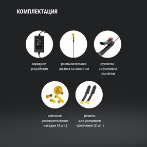 АВТОНОМНОСТЬ: Встроенный энергоемкий аккумулятор не требует постоянного источника питания, позволяя использовать прибор в местах с отсутствием электричества. ВЫСОКАЯ ПРОИЗВОДИТЕЛЬНОСТЬ: мощный насос и регулятор скорости подачи жидкости расширяют применяемость опрыскивателя, а вместительный бак позволяет распылять значительный объем жидкости. ТЕЛЕСКОПИЧЕСКАЯ ТРУБКА: прибор оснащен распылительной штангой с регулировкой длины для комфортного использования на высоте и в труднодоступных местах. ИНДИКАТОР УРОВНЯ ЗАРЯДА: позволяет оценить время работы опрыскивателя без подзаряда. УДОБНАЯ ТРАНСПОРТИРОВКА: ремень для переноски на плечах обеспечивают комфортную работу в течение долгого времени, а широкая рукоятка в верхней части делает переноску опрыскивателя более удобной. Тип аккумулятора: SLA (перезаряжаемый), в комплекте Напряжение аккумулятора: 12 В Объем бака для рабочей жидкости: 16 л Рабочее давление: 1,5-5,6 бар Тип насоса: Диафрагменный Максимальная производительность насоса: 3,6 л/мин Распылительный шланг: ПВХ 1,2 м Распылительная трубка: 46,5-81 см Масса: 4,7 кг Срок службы: 3 года 5 210,00 ₽ / шт