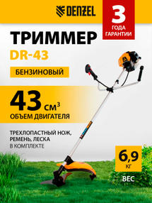 Бензиновый триммер Denzel DR-43 96273 с двигателем объемом 43 см3 и неразъемной штангой состоит из 2 частей и предназначен для ухода за газоном и формирования у него ровных границ, скашивания травы различных типов, в том числе с жесткими стеблями (полынь, крапива, лебеда). Удобен для работы в самых труднодоступных местах — на овражках, вокруг деревьев, вдоль стен и заборов. Эффективное решение этих задач обеспечивают режущие насадки — трехлопастный нож из стали и усиленная катушка из полиамида с леской. Они вращаются со скоростью 9500 об/мин, ширина скашивания составляет 25,5 и 42 см.;Инструмент не нужно включать в розетку, поэтому с ним можно работать в удаленных от дома уголках. Комплект поставки состоит из 2 частей для удобства транспортировки. Редуктор и корпус сцепления уже установлены на штангу, что облегчает его окончательную сборку. Преимущества Долговечность — двигатель с хромированным цилиндром рассчитан на длительную эксплуатацию. Прочность — штанга с толщиной стенок 1,5 мм не сломается при высоких нагрузках. Оптимизированная антивибрационная система — амортизирующие подушки минимизируют колебания, защищая суставы и сосуды пользователя. Безопасная работа — защитный кожух предотвращает вылет земли, веток и камней на пользователя. Легкий запуск — усиленный стартер и праймер позволяют быстро приступить к работе даже после длительного перерыва. Низкий расход топлива — на одной заправке триммер проработает более 40 минут. Удобная заправка — дозатор для приготовления топливной смеси входит в комплект. Быстрая подача лески — достаточно слегка ударить полуавтоматической катушкой по земле для выпуска корда. Автоматическая обрезка лески — ограничительный нож срезает лишние концы, предотвращая перегрузку и перегрев двигателя. Легкая установка насадок — бензотриммером удобно обрабатывать участки с разными типами растительности. Удобное управление — асимметричные велосипедные рукоятки с прорезиненными элементами обеспечивают надежный хват и оптимальное положение тела. Разгрузка позвоночника — одноплечевой ремень перераспределяет вес триммера, обеспечивая комфорт во время длительной работы. Мобильность — инструмент весит всего 6,9 кг без топлива, поэтому удобен в управлении и транспортировке. Дополнительные возможности — можно приобрести диск Denzel 96323 с шириной скашивания 230 мм для быстрого удаления растительности с жесткими стеблями, 96328 для скашивания молодых побегов кустарника диаметром до 3 мм, 96340 для срезания борщевика, кустарника и молодых побегов деревьев с диаметром стволов до 10 мм. Гарантия 3 года — высокое качество техники подтверждено производителем. 10 850,00 ₽ / шт