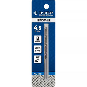 ЗУБР ПРОФ-В, 4.5 х 80 мм, сталь Р6М5, класс В, сверло по металлу, Профессионал (29621-4.5)