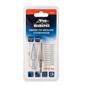 Сверло ступенчатое по металлу 4-5-6-7-8-9-10-11-12 мм, P6M5, шестигр. хвостовик// Барс 72360