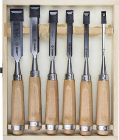 Набор стамесок-долот ЗУБР СТ-500 6 предм. (18096-H6)Модель - 18096-H6Технические характеристики:-Ширина лезвия: 6/10/12/16/20/25 мм -Материал лезвия: Сталь CrV -Материал рукоятки: Деревянная -Стальной затыльник: Да -Усилительное кольцо: да -Упаковка: Деревянный кейсСтамески-долота ЗУБР с деревянной рукояткой изготовлены из высокоуглеродистой хромванадиевой стали, что обеспечивает повышенный ресурс инструментаПреимущества:-Высокоуглеродистая хромованадиевая сталь; -Эргономичная рукоятка деревянная рукоятка; -Защитное металлическое кольцо; -Стальной затыльник для ударных работ; 5 161,20 ₽ / шт
