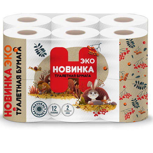Туалетная бумага «Новинка Эко» целлюлозное сырье, 2 слоя, белая, с тиснением и перфорацией, размер отрывного листа 120х92 мм ± 5%, длина рулона 12,6 ±1 м, 12 рулонов в пачке с ручкой, 4 пачки в упаковке, упаковка:полиэтиленовый мешок. 227,52 ₽ / шт