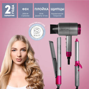 Набор для укладки волос подарочный GALAXY LINE GL4722 спроектирован по последнему слову техники. Его неповторимый дизайн и эргономика никого не оставит равнодушным. В наборе есть все необходимое для создания различных причесок и укладок: фен, щипцы, плойка. Фен бережно без экстремальных температур поможет высушить и уложить Ваши волосы. Вы можете подобрать для себя идеальный режим сушки и укладки волос благодаря 2 скоростям потока воздуха и 3 температурным режимам. Насадка-концентратор препятствует рассеиванию воздушного потока и направляет струю воздуха непосредственно на конкретную прядь волос, что значительно ускоряет сушку, а функция «Холодный воздух» способствует закреплению укладки. Фен безопасен в использовании, умеренный поток воздуха не повреждает волосы. Фен имеет встроенное зеркало, что не только облегчает укладку, но и придает неповторимый стиль прибору. Щипцы в наборе предназначены для выпрямления волос. Плавающие пластины обеспечивают идеальное скольжение и эффективное выпрямление волос. Керамическое покрытие пластин хорошо распределяет температуру, не повреждает волосы и не перегревает их. Внутренняя влага не теряется, волосы не пересушиваются, выглядят здоровыми и блестящими. Набор GALAXY LINE также включает плойку диаметром 25 мм для создания естественных локонов и эффектных кудрей. Плойка имеет безопасное и долговечное керамическое покрытие, а также термоизолированный наконечник для безопасного использования. Функциональный и стильный набор для укладки GALAXY LINE GL4722 станет отличным подарком себе и близким! Позвольте себе лучшее с GALAXY LINE! Номинальная потребляемая мощность, Вт: фен - 2000 / щипцы - 40 / плойка - 50 Параметры питания, В/Гц: 220-240/50 Защита от перегрева: Да Вращающийся на 360° шнур питания: Да Максимальная температура (°С): щипцы 230° / конусная плойка 210° Длина шнура питания, м: 1,8 Длина шнура питания, м: фен - 1,6 / щипцы - 1,8 / плойка - 1,8 Номинальное напряжение, В: 220-240 Номинальная частота, Гц: 50 Размер рабочей поверхности, мм: щипцы - 100х25 Класс защиты от поражения электрическим током: II Габаритные размеры упаковки, см: 39,8х37,6х8,4 Вес брутто, кг: 1,65 В комплекте: фен, щипцы, плойка Гарантийный срок: 2 года 4 600,00 ₽ / шт