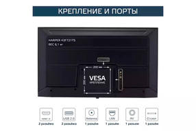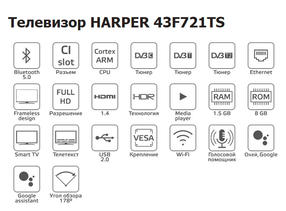 Наслаждайтесь просмотром любимых программ и фильмов в разрешении Full HD с LED телевизор Harper 43F721TS. Большой 43 - дюймовый экран с ультратонкими рамками, обладающий широкими углами обзора и разрешением 1920х1080, обеспечивает максимально четкое, яркое и насыщенное изображение. Стабильно принимать сигналы цифрового и кабельного вещания позволяют встроенные цифровые тюнеры, а с помощью функции SMART TV, на базе современной Official Google Android TV версии, вы сможете не зависеть от программы вещания, и в любое удобное время смотреть фильмы, сериалы и развлекательные шоу в сети интернет. LED телевизор Harper 43F721TS - это настоящий медиацентр с широким выбором функций: отображение программы телепередач, воспроизведение медиафайлов с внешних носителей. Для подключения LED телевизора Harper 43F721TS к различным устройствам, а также для воспроизведения видео с внешних носителей предусмотрены разъемы USB 2.0 и HDMI, а для подключения к сети интернет - Wi-Fi и LAN. 24 990,00 ₽ / шт
