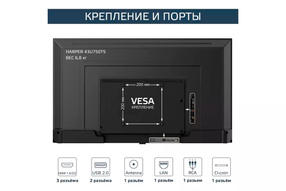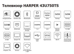 Телевизор Harper 43U750TS – это не просто “умный” телевизор! Новинка поставляется с операционной системой Яндекс ТВ и встроенным виртуальным ассистентом Алиса. Поэтому вы можете пользоваться всеми своими привычными подписками и получать доступ к любому контенту с максимальным комфортом. Управление телевизором возможно голосом, с ПДУ или с помощью любых других устройств ввода, совместимых со Smart TV. Телевизор с Алисой Harper 43U750TS - это настоящий медиацентр с поддержкой Bluetooth и широким выбором функций. Для подключения телевизора Harper 43U750TS к различным устройствам, а также для воспроизведения видео с внешних носителей предусмотрены разъемы USB и HDMI, а для подключения к сети интернет можно использовать беспроводной (Wi-Fi 2.4/5 ГГц) или проводной (подключение с разъёмом RJ-45 (витая пара)) интерфейс . 23 700,00 ₽ / шт
