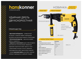 HID21100DS Дрель удар. Hanskonner, 1000Вт, 0-1100/3000 об, патрон 13мм, ДВЕ СКОРОСТИ, кабель 4