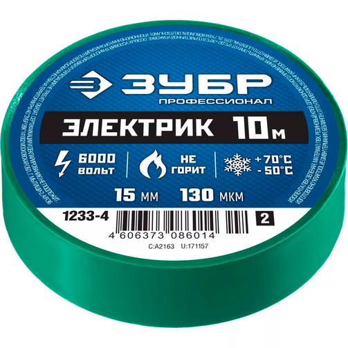 ЗУБР ЭЛЕКТРИК-10, 15 мм х 10 м, 6 000 В, белая, не поддерживает горение, изолента ПВХ, (1233-8)