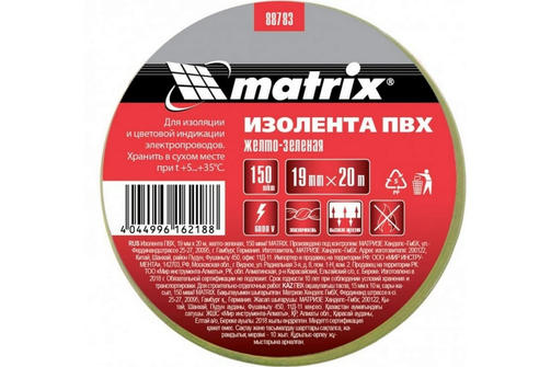 Изолента ПВХ, 19 мм х 20 м, желто-зеленая, 150 мкм Matrix 88783
