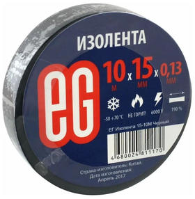 Технические характеристики изоленты EG Ширина 15 мм Длина 10 м Толщина 0.015 мм Цвет черный Тип изолента Материал ПВХ Количество в упаковке 1 шт Вес нетто 0.034 кг 50,00 ₽ / шт