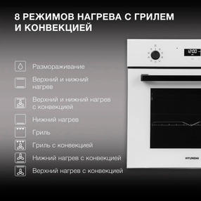 Расширьте возможности для творчества на кухне с эргономичной и многофункциональной духовкой Hyundai 6009.25 WG. Независимая конструкция. Устанавливайте духовой шкаф там, где вам удобно. Располагайте устройство под столешницей или встраивайте в кухонный гарнитур на подходящей высоте. Мощность и энергосбережение. Мощность модели – 3150 Вт. Духовка быстро нагревается и хорошо поддерживает температуру от 100 до 250 °C. Устройство экономно расходует электричество благодаря самому высокому классу энергоэффективности – А. Большая камера на 64 л. Готовьте любимые блюда и открывайте для себя новые рецепты. Отправляйте в духовку свиную рульку или утку, ставьте порционные горшочки или массивную чугунную жаровню. Внутри есть четыре уровня размещения противня. 8 режимов работы. Выбирайте необходимую программу, чтобы приготовить любимое блюдо быстрее и вкуснее. Пользуйтесь грилем, размораживайте продукты, готовьте с помощью верхнего или нижнего нагрева. Включайте конвекцию. С ней ароматная говяжья вырезка получится сочной внутри и румяной снаружи, а пасхальный кулич равномерно пропечется. Электронный таймер. Во время готовки на дисплее можно настроить таймер. В режиме ожидания на экране отображаются часы. Удобный уход. Изнутри духовой шкаф покрыт эмалью легкой очистки. Запросто удаляйте загрязнения с поверхности обычным моющим средством. Простая и безопасная эксплуатация. Дверца Hyundai 6009.25 WG оборудована двойным стеклом, поэтому духовка хорошо удерживает жар внутри и не нагревается снаружи. Яркое внутреннее освещение поможет наблюдать за процессом приготовления. Утапливаемые переключатели защищены от случайного изменения настроек, повреждений и загрязнений. В камере есть одноуровневые телескопические направляющие: с ними ставить блюда в духовку и вынимать их значительно проще. Стильный дизайн. Модель выполнена в элегантной белой расцветке и гармонично впишется в интерьер светлой кухни. 29 300,00 ₽ / шт