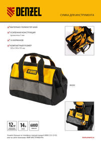 Сумка Denzel 90292 с 14 карманами, габаритами 305 х 190 х 195 мм, предназначена для хранения и транспортировки инструментов. Пригодится строителям, сантехникам, монтажникам и автовладельцам. Преимущества Изготовлена из прочного и износостойкого материала. Имеет 14 карманов разного размера для размещения инструментов, крепежа и расходников. Удобна в транспортировке благодаря двум крепким ручкам. 1 500,00 ₽ / шт